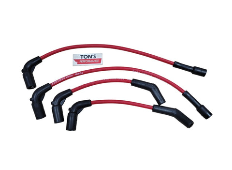 Built to meet or exceed OEM specifications. Great replacement for old worn out spark plug wires. Ton's Performance wires are built with a spiral wound alloy conductor with a high dielectric insulator, and 2 layers of silicone with final thickness of 8mm to protect against heat and tears. Ton's is one of very few companies that offers custom wires for many different applications in the aftermarket motorsports world. If you need a set of ready to install or universal wires for a custom built project, send us a message for more details.